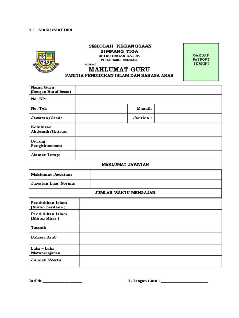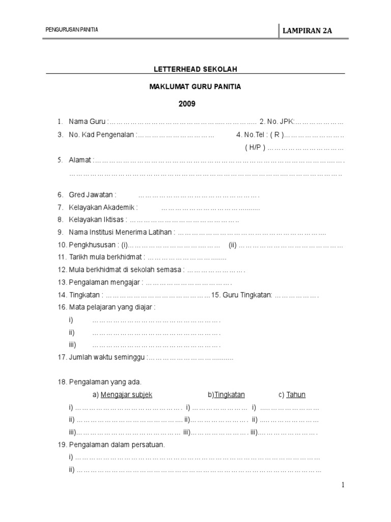 Menerapkan nilai nilai murni dalam kalangan murid guru dan kakitangan sekolah dan membentuk akhlak mulia warganya. Simpan simpan contoh borang biodata guru untuk fail panitia untuk nanti. Pengurusan panitia lampiran 2a letterhead sekolah maklumat guru panitia 2009 1. Untuk tujuan elektronik gl dan faedah pencen.
