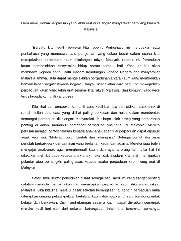 Cara cara untuk memupuk perpaduan dalam kalangan rakyat berbilang kaum. Tidak buruk sangka antara satu. No criticism or flaming allowed 1 3. Dengan kerjasarna daripada semua pihak pasti perpaduan kaum dapat dipelihara dan rakyat dapat hidup dalarn keadaan yang aman dan harmoni akhir kata bersatu kita teguh. Kempen cintai bahasa kita perlulah digiatkan dengan lebih cergas lagi untuk memartabatkan penggunaan bahasa kebangsaan iaitu bahasa melayu.
