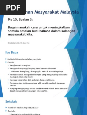 Pengenalan budi bahasa adab adalah terhad kepada benar betul atau salah dan sama ada boleh diterima moral atau sebaliknya. Malaysia sendiri secara keseluruhannya melihat ketertiban budaya adalah satu kelangsungan perkara berkaitan budi bahasa asma pedersen 2003. Dalam kesibukan kita sehari hari kita mungkin semakin lupa untuk memupuk ciri ciri keperibadian luhur baik untuk diri kita sendiri ataupun untuk anak anak kita. Ciri ciri budi bahasa seseorang yang berbudi bahasa mempunyai ciri ciri berikut.
