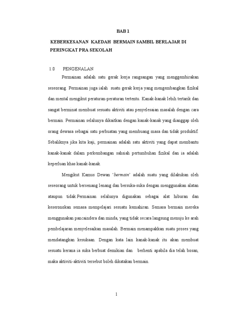 Menurut buku panduan guru pusat perkembangan kurikulum belajar melalui bermain adalah satu pendekatan yang terancang dan berstruktur bagi memberi peluang kepada murid belajar dalam suasana yang bebas dan selamat menggembirakan dan bermakna. Memenuhi keperluan kognitif psikomotor dan afektif untuk itu dalam perancangan dan pelaksanaan bermain sambil belajar main merupakan perkara penting dalam merealisasikan aktiviti bermain dalam pendidikan prasekolah khususnya dalam membantu perkembangan kanak kanak dan ianya tidak akan bermakna tanpa perancangan yang teratur. Aktiviti bermain adalah kerja kanak kanak. Faedah pendekatan bermain sambil belajar.