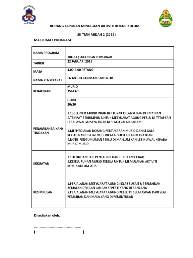 Unit kokurikulum skkr s m 2014 laporan aktiviti perjumpaan kali. Ulasan timbalan rektor hep tandatangan cop pengesahan. Borang laporan perjumpaan mingguan borang semakan keahlian kokurikulum tahun 4 2012 borang rumusan markah kokurikulum borang instrumen pemantauan aktiviti kokurikulum hari rabu borang instrumen pemantauan kokurikulum jps borang instrumen pemantauan 1murid 1sukan kpm borang permohonan membuat lawatan. Contoh laporan aktiviti kokurikulum zaidiman 9 21 am.