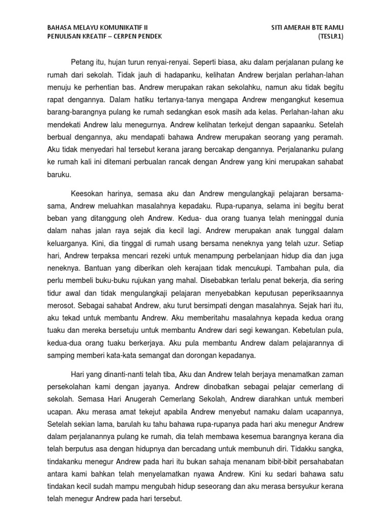 Contoh cerpen bahasa melayu. Bapak guru menyuruh untuk engerjakan halaman 7 sampai 8. Manakala sastera pula payah diberikan definisi yang universal justeru sastera bukan sesuatu yang dijumpai tetapi sebuah nama yang diberikan kepada sesebuah karya tertentu dalam lingkungan budaya tertentu. Contoh cerpen yang berikut ini saya akan memberikan link saja bila kamu masih kekurangan ide untuk membuat cerpen. Rasanya tak ada apa apa yang terkilan di hati aku ni kalau aku mati pun.