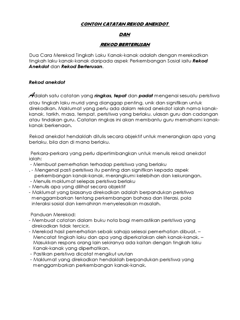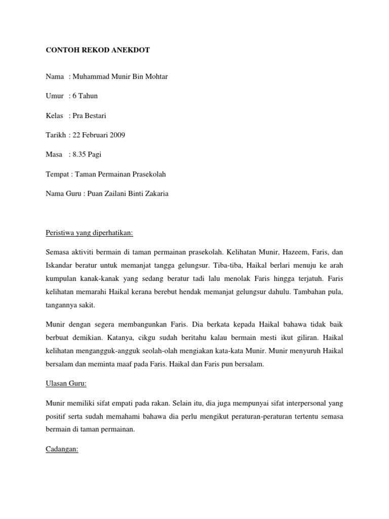 Contoh rekod anekdot kanak kanak prasekolah. Contoh rekod anekdot murid prasekolah 2019 contoh rekod anekdot murid prasekolah ulu contoh rekod anekdot murid prasekolah kpm contoh rekod anekdot murid prasekolah selangor contoh rekod anekdot murid sekolah contoh rekod anekdot murid yesus contoh rekod anekdot murid nakal. Maklumat yang perlu ada dalam rekod anekdot ialah nama kanak kanak tarikh masa tempat peristiwa yang berlaku ulasan guru dan cadangan atau tindakan guru. Nanat gaes share to. Anekdot ditulis secara objektif untuk menerangkan apa yang berlaku bila dan dimana berlaku.