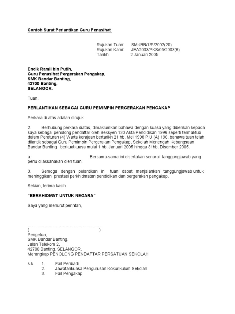 Contoh surat pelantikan guru penasihat kokurikulum. Tarikh pembayaran gaji 2012. Surat lantikan guru penasihat unit kokurikulum sekolah kebangsaan pekan nanas. Menghantar surat permohonan penubuhan kelab persatuan unit uniform sukan permainan.