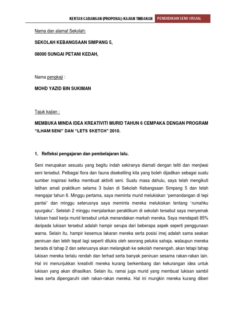 Rencana mengenai masalah disiplin di sekolah. Kandungan dalam kertas cadangan proposal kajian tindakan kertas cadangan proposal kajian tindakan tidak mempunyai format yang khusus. Sukatan pelajaran pendidikan seni visual sekolah rendah disusun bertujuan melibatkan murid dalam pelbagai kegiatan seni. Menjadi panduan kepada guru seni yang lain terhadap pengaplikasian garisan di dalam menghasilkan gambar atau objek bagi aktiviti melukis.