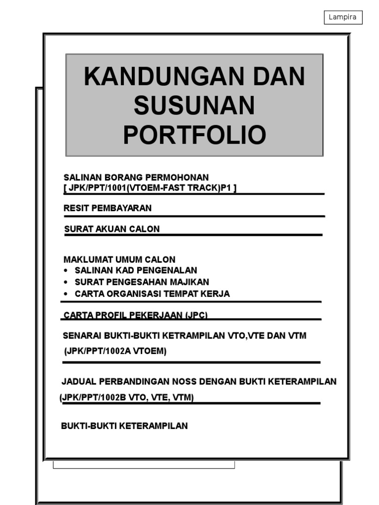5 2 portfolio dibangunkan sendiri oleh calon dengan mendapatkan khidmat nasihat daripada pp ppt. Borang permohonan persijilan jpk ppt 6 6 2014 2 salinan salinan kad pengenalan notis pendaftaran calon dan penugasan pp ppt surat akuan pengesahan calon calon pp ppt maklumat umum calon. Penyediaan portfolio calon ppt. Salinan skm tertinggi yang dimilliki jika ada dan berkaitan.