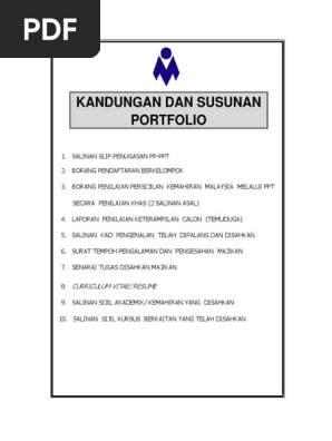 Kandungan dan susunan portfolio calon. 5 0 portfolio calonkaedah membangunkan portfolio5 1 portfolio calon adalah berbentuk sebuah fail bagi menyimpan mengumpul segala jenis bukti pencapaian terdahulu secara tersusun dan sistematik mengikut keperluan setiap profil tugasan noss 5 2 portfolio dibangunkan sendiri oleh calon dengan mendapatkan khidmat nasihat daripada pp ppt 5 3 kandungan dan susunan portfolio calon susunatur di. 5 3 kandungan dan susunan portfolio calon susunatur di lampiran c hendaklah seperti berikut 5 3 1 salinan kandungan dan susunan portfolio calon. Kandungan susun atur portfolio. Bahagian ini perlu diisi oleh calon yang akan ditemuduga.