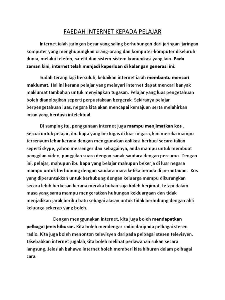 Jadual di bawah menunjukkan taburan frekuensi keseronokan terhadap komputer. 1998 internet merupakan satu medium yang memudahkan komunikasi dan pemerolehan maklumat dan dapat memudahkan guru membantu murid untuk membentuk pengetahuan sedia ada supaya pelajar dapat menerima pengetahuan baru. Antara kebaikan internet dalam kehidupan seharian terutamanya bagi seorang pelajar sama ada di peringkat sekolah mahupun universiti ialah kebanjiran ilmu pengetahun yang membolehkan pelajar mendapat apa sahaja maklumat yang diingini dengan menggunakan enjin carian google yahoo dan sebagainya tanpa perlu bersusah untuk pergi ke perpustakaan dan dalam masa yang sama mampu menjimatkan masa. Tulis sebuah karangan tentang kepentingan internet kepada pelajar.