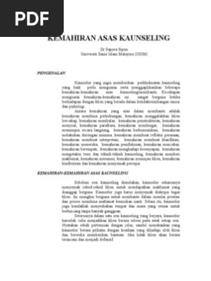 Modul ini mengupas beberapa konsep asas dan strategi dalam kaunseling. Kemahiran dalam sesi kaunselingkaunselor yang ingin memberikan perkhidmatan kaunseling yang baik perlu menguasai serta menggaplikasikan beberapa kemahiran kemahiran asas kaunseling membantu. Oleh yang demikian sebelum seseorang kaunselor memberi perkhidmatan kaunseling mereka perlulah terlebih dahulu menguasai beberapa kemahiran asas yang perlu di dalam proses menolong. Share embed kemahiran asas kaunseling pdf please copy and paste this.