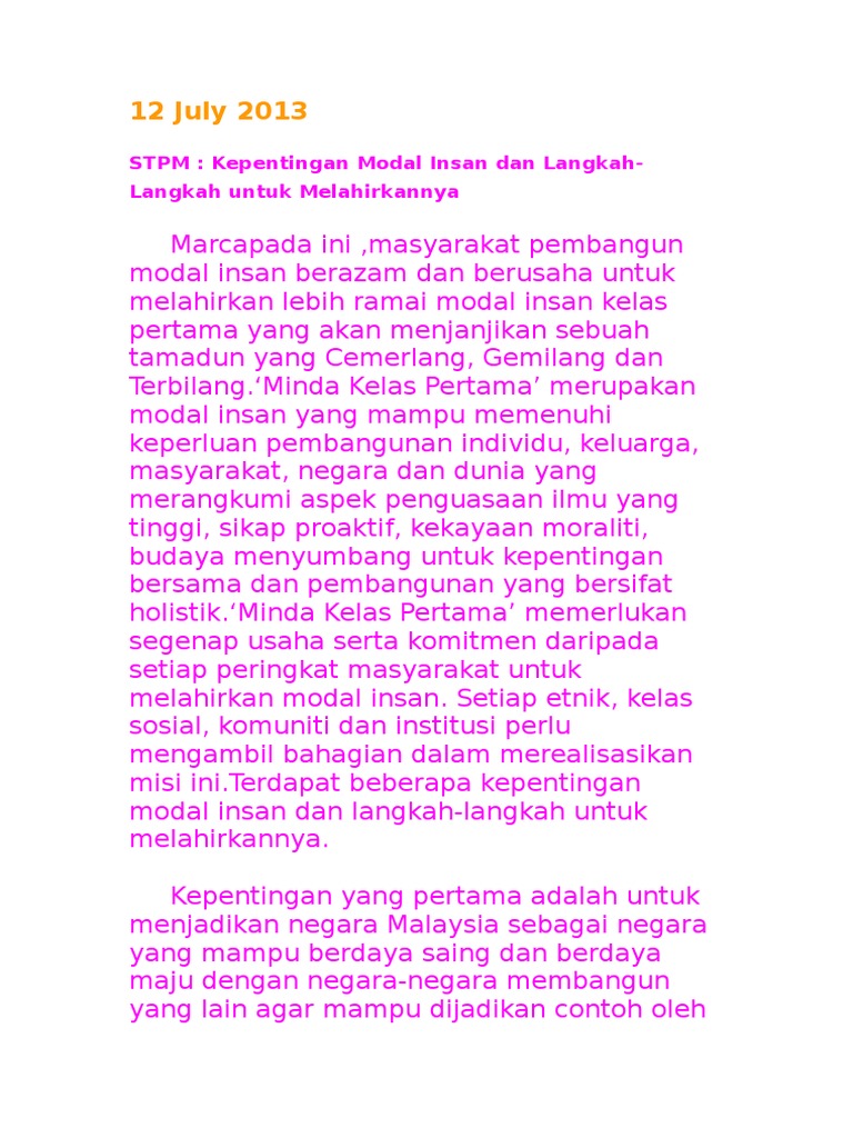 Kepentingan modal insan kelas pertama. Modal insan berminda kelas pertama ialah masyarakat yang berpengetahuan mampu berdaya saing berbudaya kerja cemerlang berintergriti dan memiliki kekuatan moral. Minda kelas pertama difahami sebagai ciri ciri modal insan yang mampu memenuhi keperluan pembangunan individu keluarga masyarakat negara dan dunia. Ciri ciri tersebut merangkumi aspek penguasaan ilmu yang tinggi sikap proaktif kekayaan morality dan budaya yang menyumbang untuk kepentingan. Academia edu is a platform for academics to share research papers.