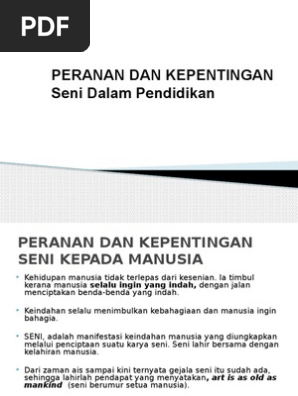 Kepentingan seni dalam pendidikan pdf. Kefahaman dalam ketiga tiga bidang ini boleh dicapai melalui penerokaan memperoleh. 1 4 1 teori pembelajaran yang menyokong seni dalam pendidikan a teori konstruktivisme konstruktivisme ialah perspektif psikologi dan falsafah yang menyatakan individu membentuk atau mengkonstruk tentang apa yang dipelajari dan difahami. Pendapat tokoh terhadap seni murid boleh berinteraksi dan meningkatkan keupayaan bersosial selain meningkatkan keyakinan diri. 3 0 kepentingan seni dalam pendidikan kepada pendidik seni dalam pendidikan adalah untuk membantu perkembangan menyeluruh danseimbang setiap insan dari segi intelek rohani emosi.