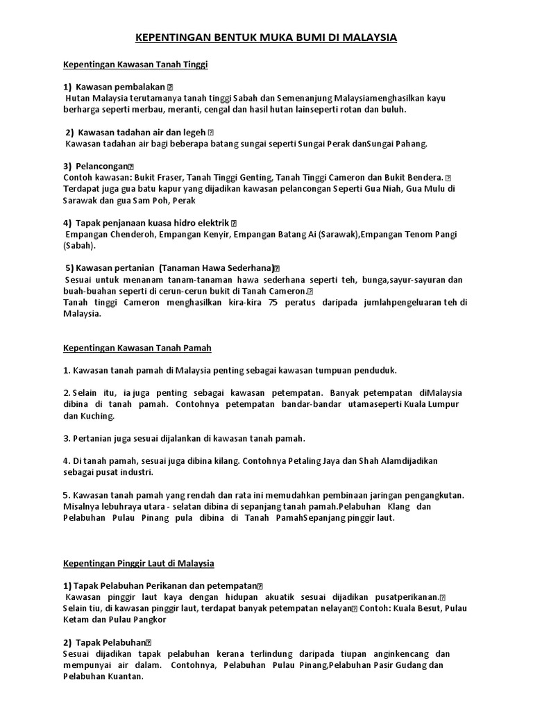 Kepentingan tanah tinggi di malaysia berserta contoh kawasan. Gurung murud 2 425 meter merupakan gunung tertinggi di sarawak yang terletak di banjaran tama abu. Hutan malaysia terutamanya tanah tinggi sabah dan semenanjung malaysia menghasilkan kayu berharga seperti merbau meranti cengal dan hasil hutan lain seperti rotan dan buluh. Tumpat dungun felda tunku 3 kawasan berpenduduk jarang kurang daripada 50 orang 1km persegi tertumpu di kawasan yang berhutan tebal dan kawasan tanah tinggi melibatkan kawasan bergunung ganang dan pedalaman contoh kawasan. Selain itu pusat peranginan seperti ini juga sesuai untuk mereka yang meminati aktiviti pendakian dan berkhemahan selain.