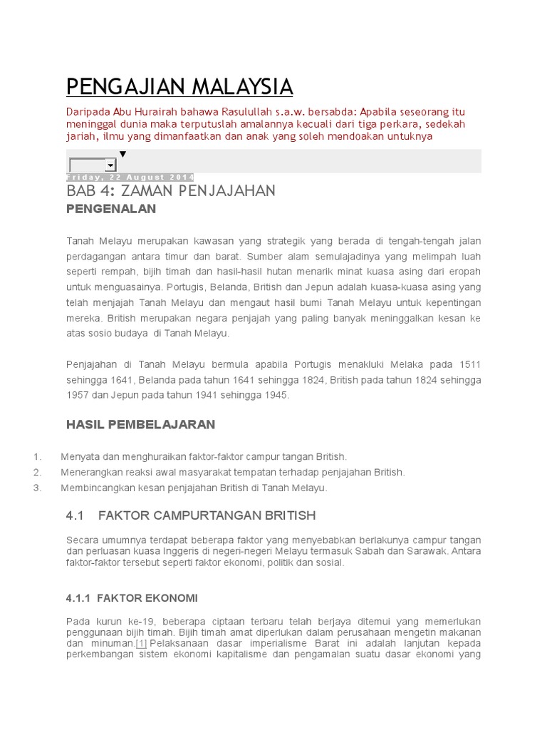 Kesan penjajahan british di tanah melayu pengajian malaysia. Penjajahan british di tanah melayu telah membawa bersama dasar dasar pentadbiran yang selaras dengan kemajuan mereka dari segi ilmu pengetahuan prinsip sistem struktur dan dasar yang diamalkan dalam pemerintahan mereka adalahjauh berbeza dengan sistem dan dasar pemerintahan yang telah sedia ada dan digunapakai di tanah melayu. Penjajahan portugis menduduki melaka selama 130 tahun 1511 1641. Kuasa ketiga yang wujud di tanah melayu adalah inggeris british. Penglibatan british dalam hal ehwal sosioekonomi tanah melayu berlaku seawal tahun 1786 dan terhenti seketika setelah penjajahan jepun di tanah melayu yang bermula pada tahun 1942 1945.