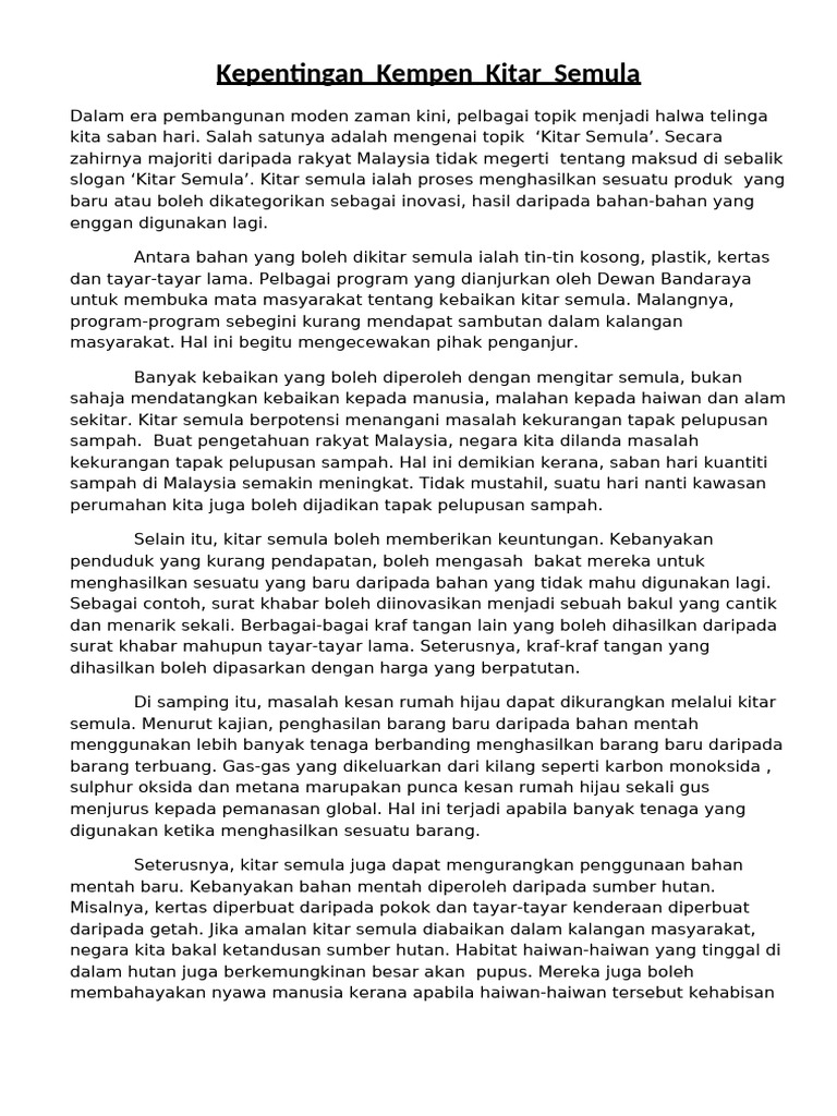 Kitar semula adalah menggunakan semula bahan bahan terpakai menjadi bahan lain yang bermanfaat. Kegagalan kitar semula impak kepada alam sekitar. Abc cc embed powtoon is not liable for any 3rd party content used. Pendek kata amalan kitar semula yang dipraktikkan oleh semua rakyat malaysia dapat memelihara alam sekitar di negara kita.