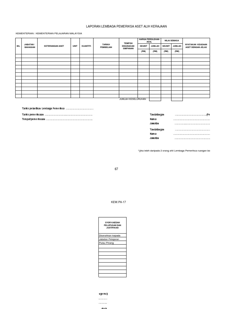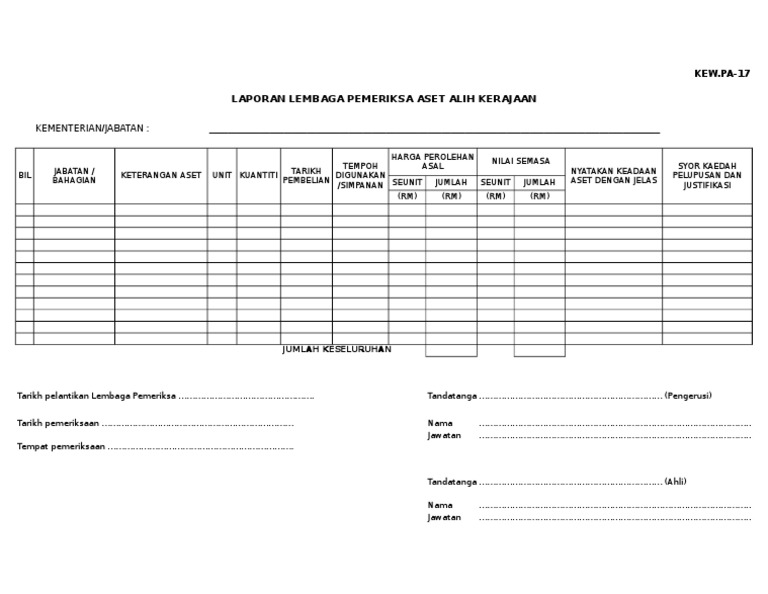 Kew pa 17 laporan lembaga pemeriksa aset alih kerajaan bil jabatan bahagian keterangan aset unit kuantiti harga perolehan asal nilai semasa nyatakan keadaan aset dengan jelas syor kaedah pelupusan dan justifikasi seunit jumlah seunit jumlah rm rm. Kerajaan kew pa 22 yang boleh diperolehi di alamat seperti di para 5. 4 2 ketua jabatan hendaklah mempertimbangkan permohonan pindahan di kew pa 17. Sukacitanya merujuk perkara di atas.