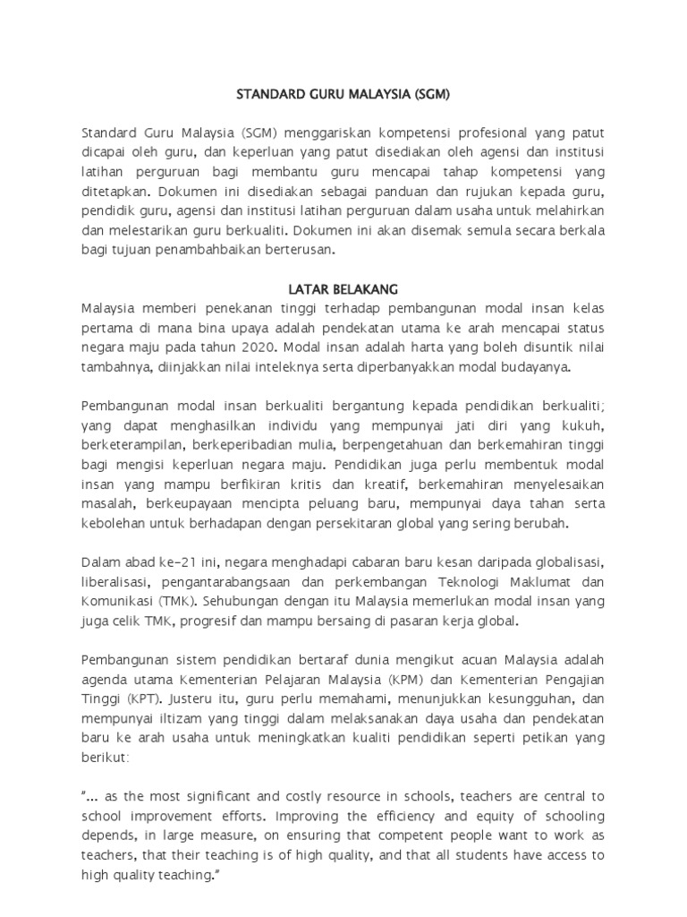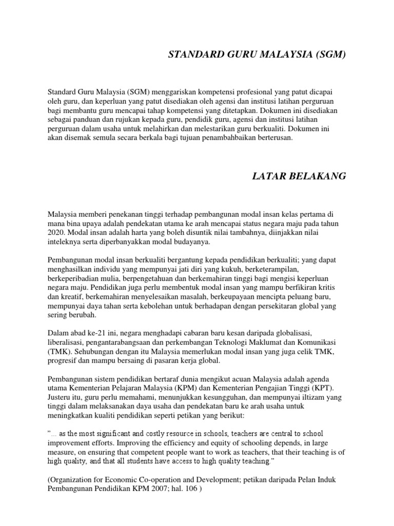 Pembangunan sistem pendidikan bertaraf dunia mengikut acuan malaysia adalah agenda utama kementerian pelajaran malaysia kpm dan kementerian pengajian tinggi kpt. Program latihan secara sistematik yang menjurus ke arah peningkatan profesionalisme dan pembangunan kerjaya serta kecemerlangan perkhidmatan. Standard guru malaysia sgm pengertian standard guru malaysia standard guru malaysia merupakan piawaian yang menggariskan kompetensi professional yang patut dicapai oleh guru dan keperluan yang patut disediakan oleh agensi dan institusi latihan perguruan bagi membantu guru guru mencapai tahap kompetensi yang ditetapkan. Kami guru malaysia yakin bahawa tujuan utama pendidikan ialah berusaha menuju ke arah pembentukan warganegara yang berilmu yang taat setia yang bertanggungjawab dan berkebolehan yang menyedari betapa pentingnya usaha kami ke arah kebenaran dan ke arah pencapaian hasrat yang gemilang dan yang percaya akan demokrasi kebebasan perseorangan dan prinsip prinsip rukunegara.