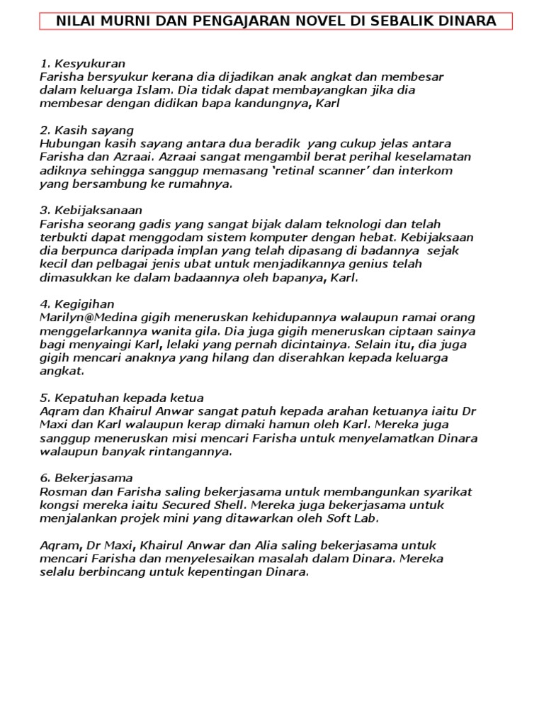 Kepincangan masyarakat dan tindakan watak yang tidak wajar dicontohi novel tingkatan 4 kepincangan masyarakat dan tindakan watak yang tidak wajar dicontohi. Novel ini telah memaparkan beberapa peristiwa menarik. Novel di sebalik dinara dayang noor azraai mengimbas kembali peristiwa 26 tahun lalu ketika keluarganya menerima farisha sebagai anak angkat. Novel yang saya pelajari ialah di sebalik dinara karya dayang noor yang mengisahkan tentang persaingan dunia sains antara karl dan medina sehingga melupakan unsur unsur kemanusiaan.