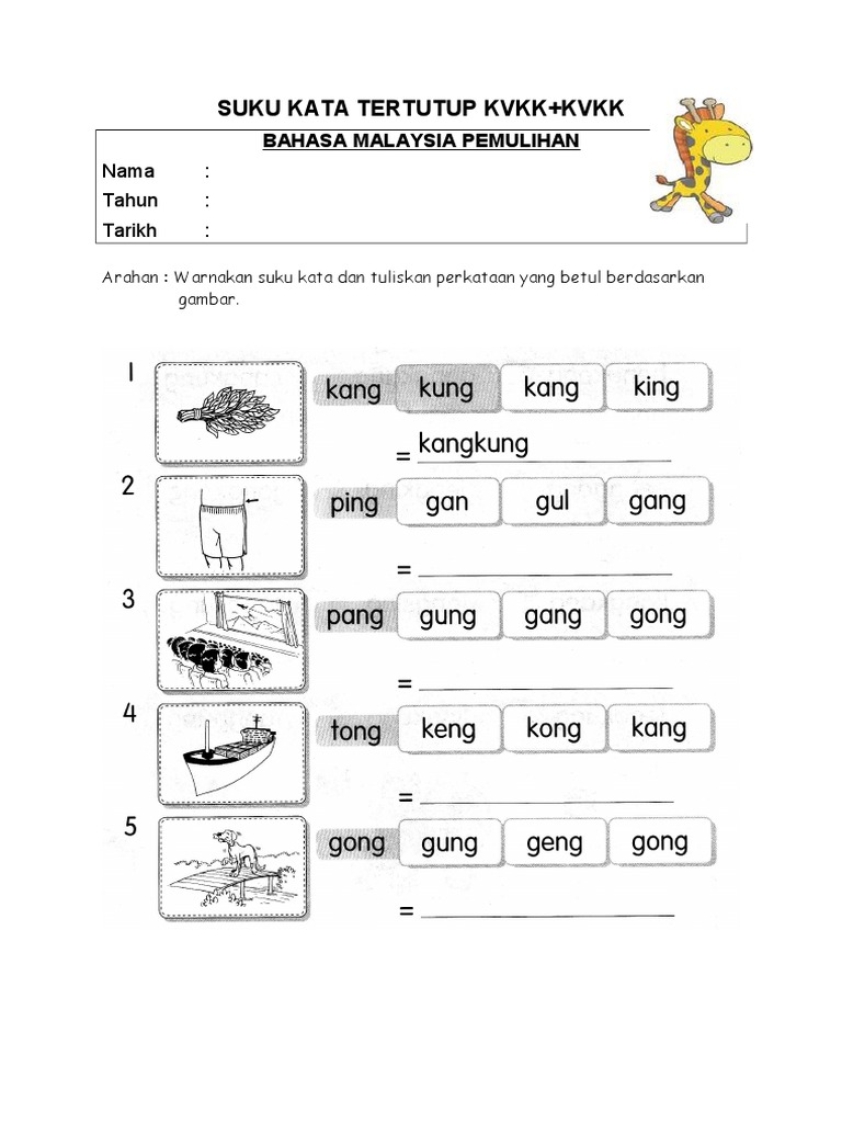 Kali ini saya ingin berkongsi perkataa 3 suku kata kvkk terdapat 22 perkataan 3 suku kata kvkk seperti tempurung genderang pemborong lempoyang tembelang dan lain lain lagi. Kali ini saya ingin berkongsi suku kata kvkk. Kemudian murid menulis perkataan yang dipadankan menggunakan garisan yang disediakan. Link to this worksheet.