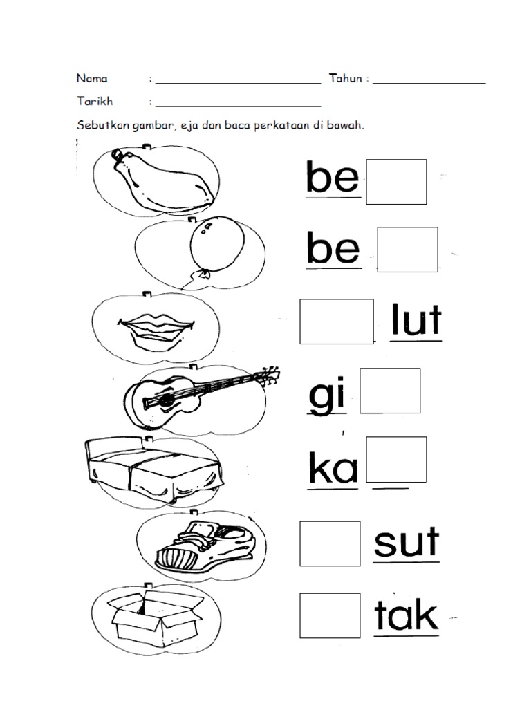 Sukukata kvkvk minta anak anak bunyikan suku kata cantumkan suku kata kv kvk dan bunyikan menikut gambar eja dan baca perkataan dan rangkai kata cetak lembaran kerja untul latihan bacaan anak anak. Lembaran kerja kemahiran 4 suku kata terbuka kv. Unknown 13 december 2012 at 07 58. Perkongsiaan lembaran kerja prasekolah eja dan tulis suku kata kvkvadalah daripada cikgu aa.
