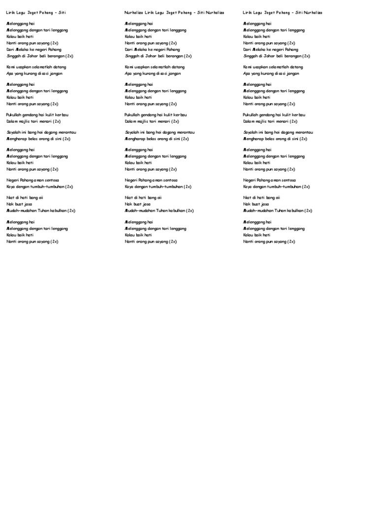 Melenggang hai melenggang dengan tari lenggang kalau baik hati nanti orangpun sayang 2x dari melaka ke negeri pahang singgahdi johor beli berangan 2x kami ucapkan. Ramlee joget pahang melenggang hai melenggang dengan tari lenggang kalau baik hati nanti orang pun sayang dari melaka ke negeri pahang singgah di johor beli berangan. Joget pahang melenggang hai melenggang dengan tari lenggang kalau baik hati nanti orang pun sayang 2x dari melaka ke negeri pahang singgah di johor beli berangan 2x kami ucapkan selamatlah datang apa yang kurang dicaci jangan melenggang hai melenggang dengan tari lenggang kalau baik hati. Melenggang hai melenggang dengan tari lenggang kalau baik hati nanti orangpun sayang melenggang hai melenggang dengan tari lenggang kalau baik hati nanti orangpun sayang.