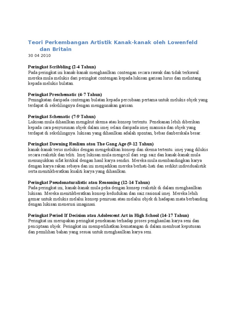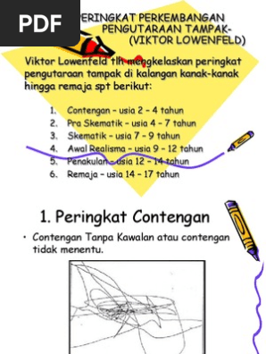 Lukisan kanak kanak dapat memberi lebih banyak maklumat tentang perkembangan mereka daripada catan kerana ianya menggunakan krayon pensil dan pen. Anak anak cenderung mengalami kenikmatan kinestetik yaitu kesenangan atau kenikmatan untuk bergerak dan membuat tanda. Peringkat pra remaja 10 13 tahun c peringkat schematic 7 9 tahun pada peringkat ini kanak kanak kurang cenderung untuk melukis imej objek berbanding pada peringkat awal tadi. Lukisan banyak menggunakan bentukgeometri.
