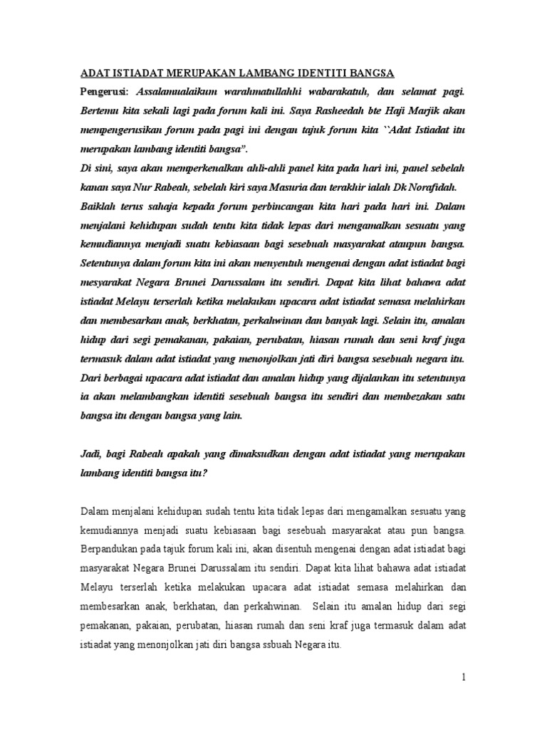 Setelah selesai sesuatu istiadat dijalankan istiadat menutup gendang jaga jaga akan diadakan disertakan dengan majlis membaca doa selamat. Kepada adat istiadat yang diwarisi turun temurun itulah yang mendorong orang orang brunei hidup bertamadun sejak dahulu lagi dengan mempunyai keperibadiannya yang tinggi yang sentiasa terpelihara walaupun ia menempuh berbagai bagai ujian. Adat istiadat diraja brunei rumi boleh didapati di pusat sejarah brunei kertas kerja ceramah dan bengkel adat istadat boleh didapati di jabatan adat istiadat negara majlis istiadat pemasyhuran tokoh adat istaidat sepanjang zaman sempenan hari adat istiadat 2014 boleh didapati di jabatan adat istiadat negara naubat dan gendang jaga jaga. Adat istiadat merupakan kebiasaan yang dilakukan oleh nenek moyang indonesia yang masih dilestarikan sampai sekarang oleh masyarakat didaerah tersebut yang masih mempercayainya sebagai tradisi yang harus dilestarikan.