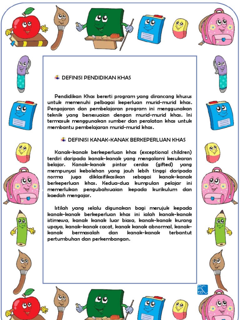 Peranan guru dalampengajaran dan pembelajaranuntuk membantu kanak kanak bermasalah 23. Maksud definisi menurut kamus dewan edisi ke 3 ialah kenyataan yg ringkas dan padat bagi menjelaskan konsep atau makna sesuatu kata frasa dan lain lain takrif. Definisi kanak kanak berkeperluan khas kanak kanak berkeperluan khas exceptional children terdiri daripada kanak kanak yang mengalami kesukaran belajar. Merujuk kepada satu pendekatan rancangan pendidikan strategi kaedah dan teknik mengajar untuk kanak kanak bukan normal tetapi luar biasa.