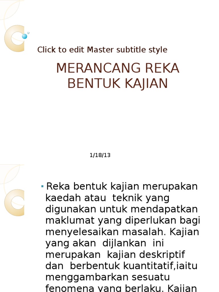 Maksud reka bentuk kajian. Tiada satu reka bentuk yang boleh digunakan untuk semua kajian tetapi satu kajian boleh menggunakan beberapa reka bentuk kajian yang berbeza. Ia juga berfungsi sebagai panduan dalam membantu penyelidik dalam proses memungut menganalisis dan membuat pentafsiran hasil daripada penyelidikan yang dijalankan. Metodologi kajian 3 1 reka bentuk kajian kajian tinjauan survey ini merupakan kajian inferensi dengan menggunakan data data kuantitatif dan kualitatif yang dipungut melalui soal selidik dan temu bual. Data data yang diperolehi daripada sampel rawak ini kemudiannya dianalisis dan dipersembahkan dengan statistik perihalan dan ujian signifikan.