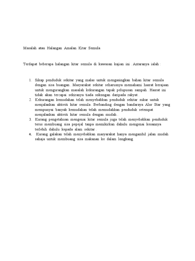 Terdapat segelintir penduduk yang tidak mempedulikan amalan kitar semula ini. Masalah atau halangan amalan kitar semula. Antara prakarsa yang diperkenalkan adalah amalan kitar semula di mana bahan bahan buangan diproses menjadi bahan baharu atau bahan kitar semula dan digunakan untuk fungsi yang sama atau berlainan. Misalnya takungan air hujan boleh digunakan sebagai air siraman pokok atau tumbuhan yang kita tanam di halaman rumah.