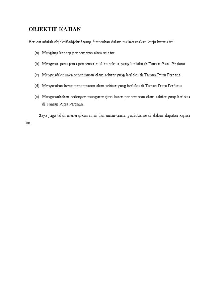 Saya minta izin nak copy objektif kajian n kaedah kajian awak ye untuk dijadikan contoh bahan pt3 saya harap awak x kesah n halalkan semuanya thanks alot n good luck in your life. Objektif kajian objektif kajian saya ialah mengkaji konsep pencemaran alam sekitar di kawasan ss 13 subang jaya. Banyak punca atau penyebab kepada perkara ini yang antara lain disebabkan pembangunan yang tidak terkawal dan pertambahan penduduk yang tinggi terutama di bandar besar yang menyebabkan semakin banyak sumber yang diperlukan untuk meningkatkan hasil. Objektif kajian antara objektif kajian yang saya peroleh ialah.