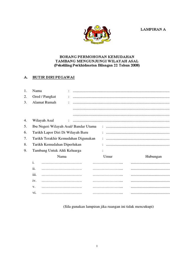 Pekeliling perkhidmatan bilangan 16 tahun 2007 bayaran pakaian istiadat bantuan bayaran pakaian black tie dan bayaran pakaian menghadiri upacara rasmi. Kemudahan kepada pegawai perkhidmatan awam yang memenuhi takrifan pegawai bertukar wilayah berdasarkan peraturan perenggan 7 pekeliling perkhidmatan bilangan 5 tahun 1978. 1 lampiran a borang permohonan kemudahan tambang mengunjungi wilayah asal pekeliling perkhidmatan bilangan 22 tahun 2008 sila gunakan lampiran jika ruangan ini tidak mencukupi. Pekeliling perkhidmatan bilangan 22 tahun 2008 kemudahan tambang mengunjungi wilayah asal bagi pegawai yang bertukar wilayah created date.
