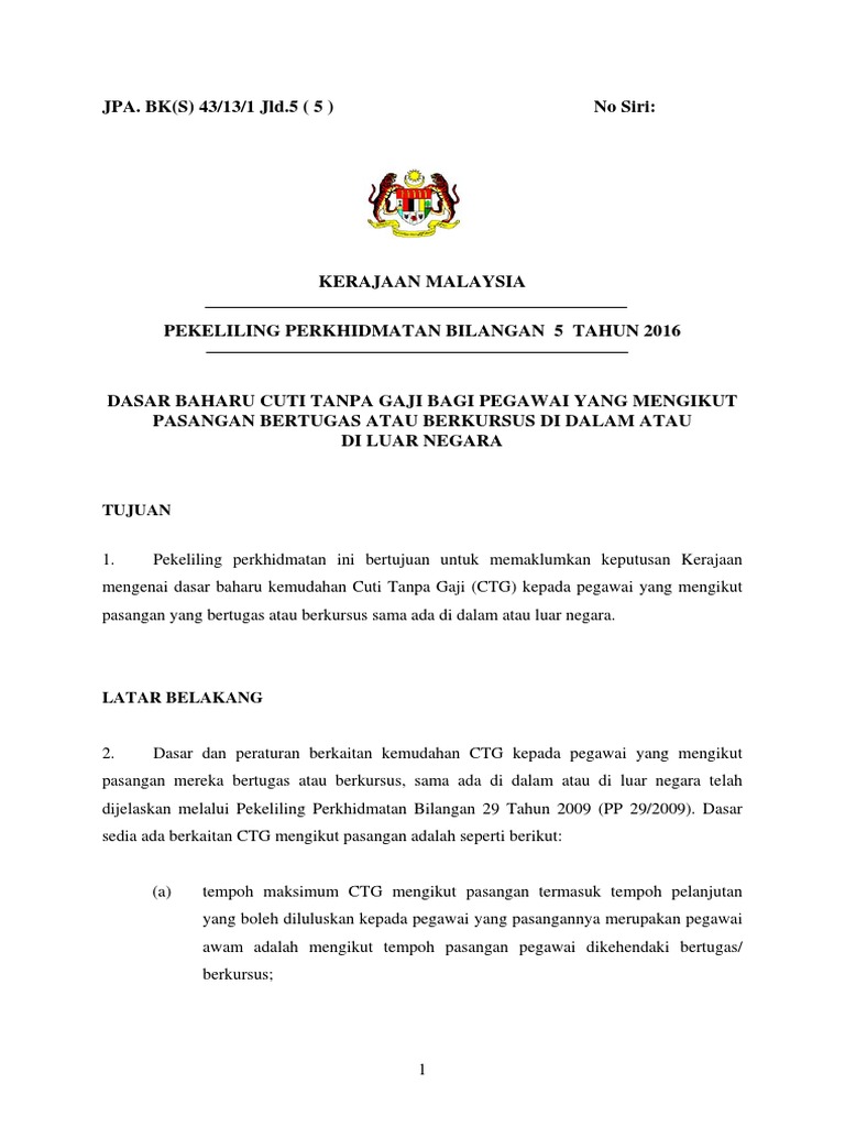 Pekeliling perkhidmatan bilangan 5 tahun 2016. Bilangan tarikh 16 dlm 11 o 9650 03 kit 5 28 april 2016 pelaksanaannya adalah mengikut syarat serta kaedah yang diperincikan dalam pekeliling perkhidmatan bilangan 1 tahun 2016 yang boleh dimuat naik. Mengenai pemberianpemindahan gaji dengan amaun bersamaan satu 1 kenaikan. Kerajaan malaysia pekeliling perkhidmatan bilangan 5 tahun 2016 dasar baharu cuti tanpa gaji bagi pegawai yang mengikut pasangan bertugas atau berkursus di dalam atau di luar negara tujuan 1. Pekeliling perkhidmatan ini pada keseluruhannya dipanjangkan kepada semua perkhidmatan awam negeri pihak berkuasa berkanun dan pihak berkuasa.