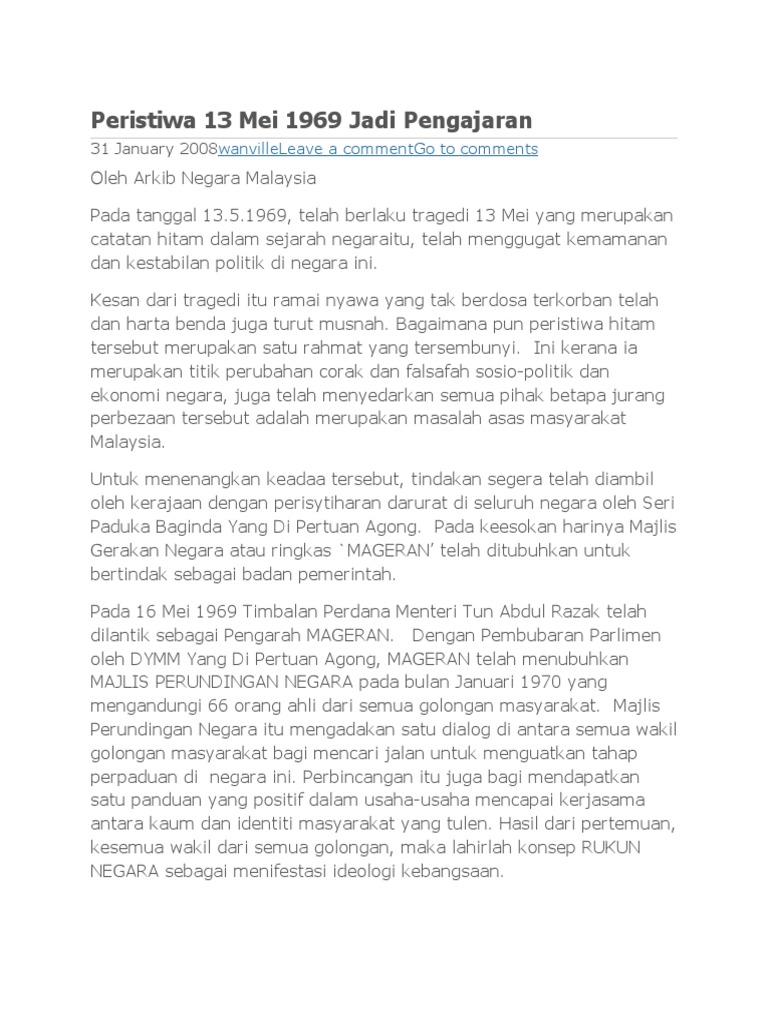 Pengajaran daripada tragedi 13 mei 1969. Pengajaran daripada peristiwa 13mei 1969 sudah tiada lagi dalam jiwa anak anak pelbagai bangsa malaysia ini. Tragedi peristiwa 13 mei 1969 ini memberi kepada kita pengajaran dan kerajaan telah mengadakan dasar perpaduan antara kaum dan masyarakat sekeliling untuk dijadikan panduan dan pegangan masyarakat yang berbilang kaum bagi menjalankan hidup secara aman dan sentiasa bersifat berbaik sangka antara satu sama lain kesedaran penting di kalangan rakyat bahawa sikap hormat menghormati bertolak. Kuala lumpur peristiwa berdarah rusuhan kaum paling dahsyat di negara ini pada 13 mei 1969 perlu menjadi pengajaran betapa pentingnya masyarakat berbilang kaum di negara ini untuk terus bersatu padu dan hidup dalam harmoni. Peristiwa 13 mei sememangnya bukan suatu peristiwa yang berlaku secara tiba tiba atau kerana sebab sebab yang spontan tetapi ianya merupakan suatu rentetan kepada sebab sebab atau peristiwa yang telah berlaku sebelumnya.