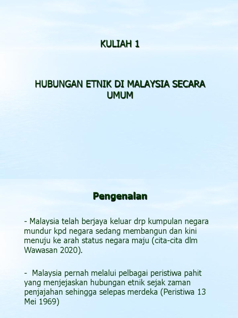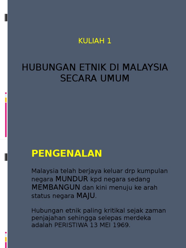 Pengenalan hubungan etnik di malaysia secara umum. Konsep pribumi secara khusus pula merujuk kepada penduduk asal malaysia yang terdiri daripada orang melayu dan orang asli di semenanjung malaysia serta kumpulan etnik pribumi di sabah dan sarawak. Penjadian malaysia dapat dipandang dari era kesultanan melaka yang telah memerankan model perwujudan sebuah negara. Hubungan etnik di malaysia secara umum bab 1 hubungan etnik di malaysia. Kepentingan hubungan etnik yang harmonis.
