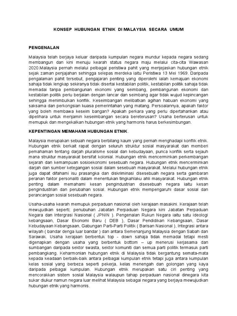 Konsep hubungan etnik dimalaysia secara umum mohamad b abdul karim sekolah pendidikan sains sosial universiti malaysia sabah. Diharap pelajar dapat membina dan memahami hubungan etnik yang harmoni di malaysia. 1 2 pembinaan negara bangsa dan hubungan etnik di malaysia 8 1 2 1 era konflik 1945ă1960 9 1 2 2 era stabil tetapi tegang. Secara umum ia dapat dibahagikan.