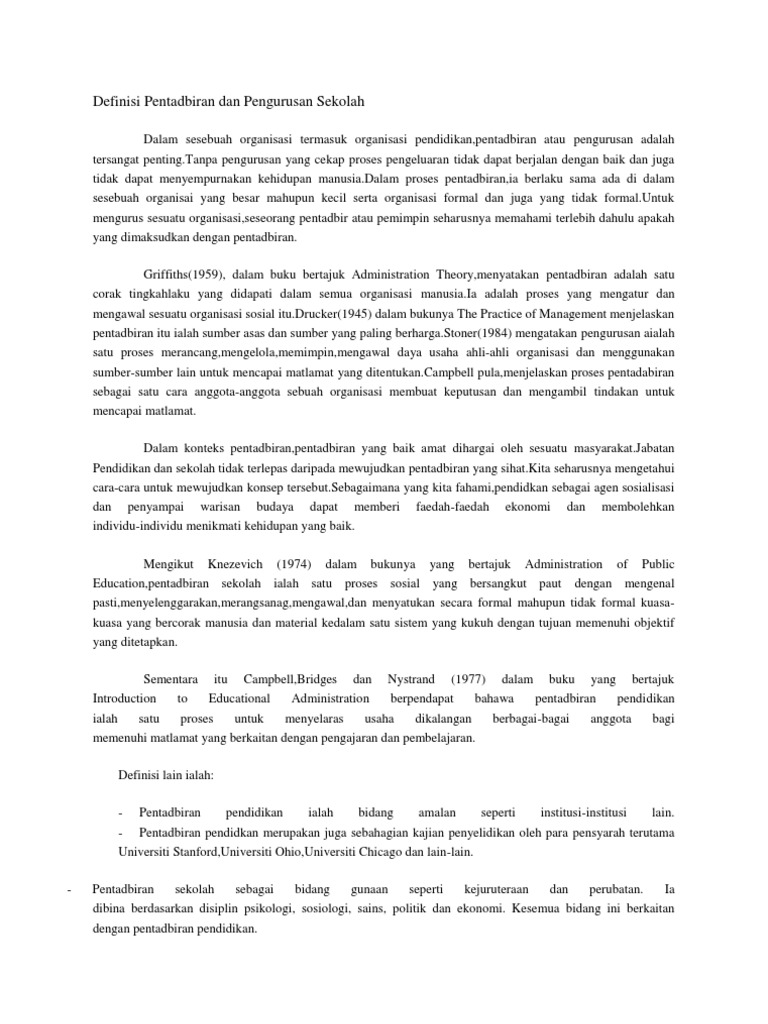 Doc definisi dan konsep pengurusan dan pentadbiran. Pemimpin dan pengikut hendaklah sentiasa taat mentaati dan harga menghargai di antara mereka. Fungsinya untuk menyempurnakan aspek pelaksanaan pentadbiran dan pengurusan pendidikan peringkat rendah dan menengah untuk mencapai dasar pendidikan bagi sekolah rendah dan menengah harian di malaysia. Organisasi pengurusan dan pentadbiran sekolah.