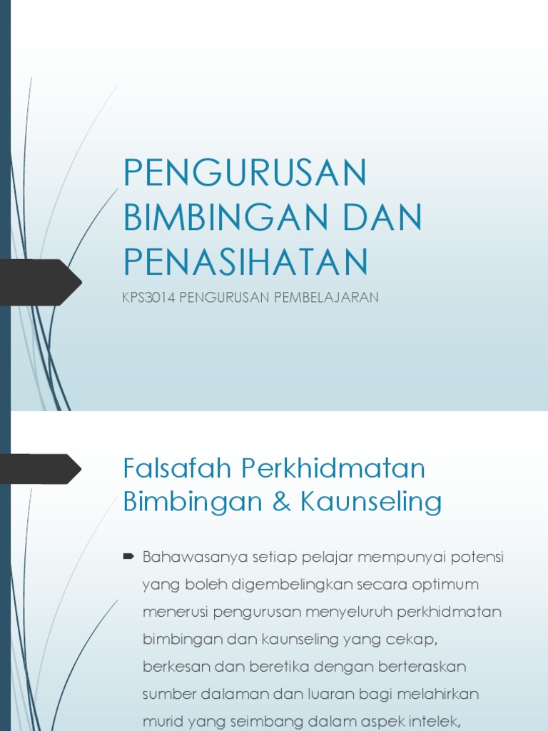 Pengurusan penasihatan murid pengurusan bimbingan dan penasihatan bab 9. Pengurusan penasihatan murid definisi 1. Pengurusan tingkah laku pengurusan disiplin bab 8. Pengurusan pensihatan murid terdiri daripada 3 komponen utama iaitu bimbingan penasihatan dan mentoring.