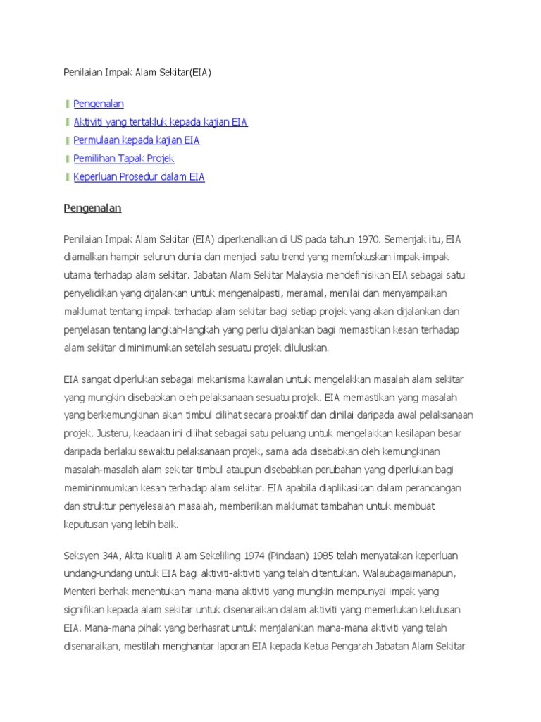 Menurut jabatan perlindungan alam sekitar dalam rujukan 499. Di malaysia seksyen 34a akta kualiti alam sekeliling 1974 pindaan 1985 menekankan keperluan undang. Semenjak itu eia mula berkembang ke serata negara. Menilai keseluruhan impak positif dan negatif terhadap alam sekitar objektif utama 1 meneliti dan memilih project option yang terbaik 2 mengenalpasti dan memberi langkah langkah kawalan dan tebatan bersama rancangan projek 3 meramal impak penting yang berkekalan ke atas alam sekitar.