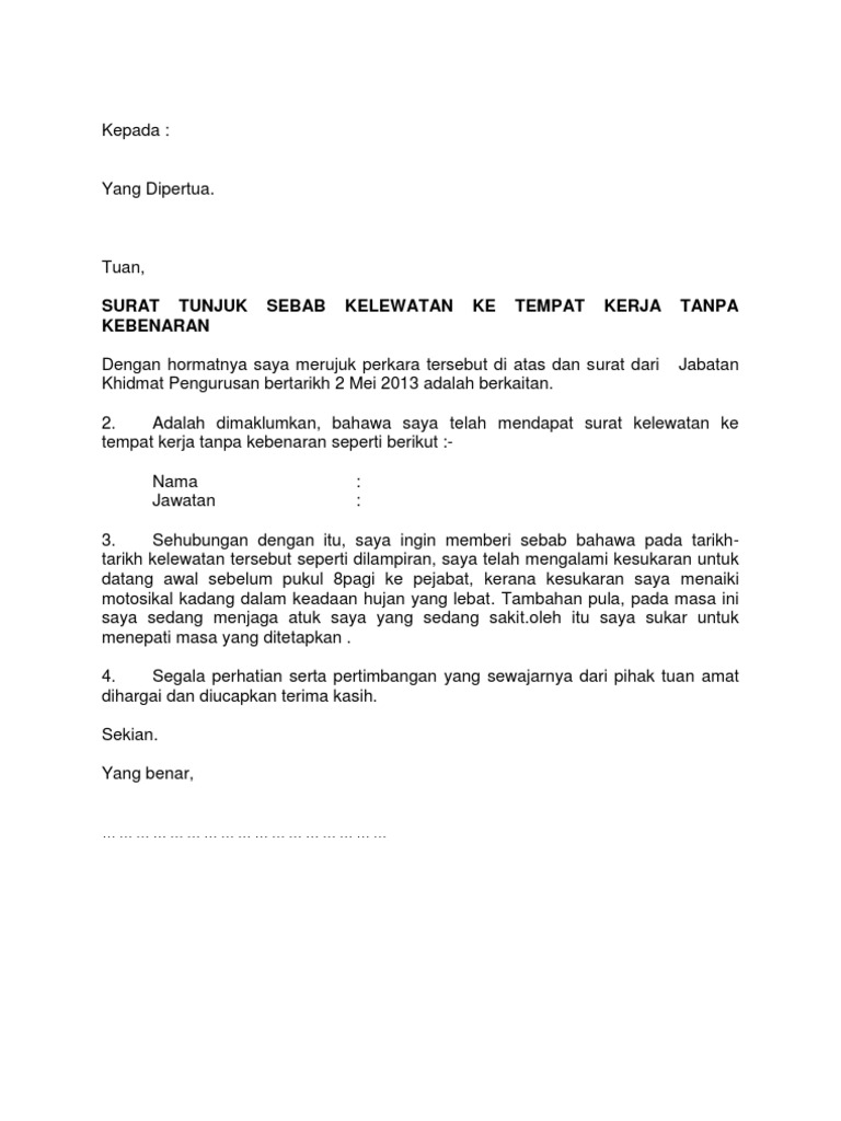 Tuan pengurus foxhill sdn. Surat penjelasan tunjuk sebab ini sangat penting agar kita tidak dikenakan tindakan tata tertib. Pengurus tuan puan surat tunjuk sebab lewat hadir kerja saya dengan segala hormatnya merujuk kepada perkara saya lewat hadir kerja pada. Contoh surat tunjuk sebab mudah dan terbaik.