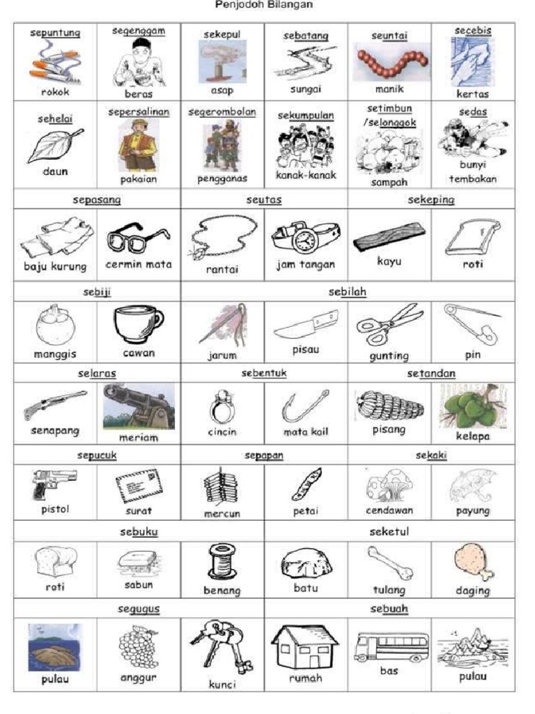 Penjodoh bilangan tahun 6 bergambar. Penjodoh bilangan bergambar ruangan penjodoh bilangan ini menghuraikan tentang perkataan yangdigunakan berpasangan dengan nama apabila menunjukkan bilangan iaitu seperti ekor untuk binatang helai untuk kain biji untuk buah bilah untuk pisau dan sebagainya. Bahasa melayu tahun 1 by ummuaisyauqi. Penjodoh bilangan digunakan sebelum sesuatu kata atau nama yang menunjukkan jumlah atau bilangan. Penjodoh bilangan bergambar sering murid murid keliru untuk menggunakan beberapa penjodoh bilangan pada objek yang sesuai antara contohnya.