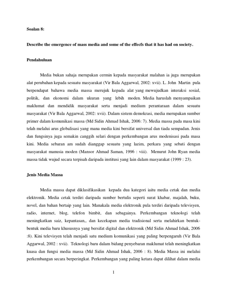 Pada masa yang sama ledakan teknologi hari ini juga merupakan cabaran dalam mengekalkan perpaduan kaum. Secara kesimpulan media massa merupakan cabaran yang paling besar bagi memupuk perpaduan kaum dalam kalangan masyarakat di negara ini. Media massa sewajarnya berperanan membantu usaha dalam membangunkan dan memajukan negara. Di samping kesan baik media massa juga mampu membawa kesan negatif kepada masyarakat dan negara.