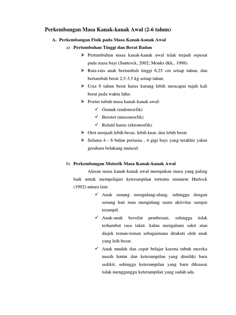 Perkembangan awal kanak kanak 4 6 tahun. Tentu saja hal ini sangat baik utk mengembangkan otot otot kecil maupun. A perkembangan fizikal kanak kanak pada tahap ini mengalami pertumbuhan lebih kurang 12 inci setahun dan berat badanny abertambaha padar kadar 5 paun setahun saiz badannye juga berubah dengan bahagian kakinya mengalami pertumbuhan dengan lebih cepat berbanding bahagian lain apabila menjangkau umur 6 tahun bahagian kaki meliputi 45 daripada panjang badannya pada permulaan tahap ini kanak. Pada saat yang sama dia masih akan mengalami ketidakamanan yang datang dari melangkah lebih jauh ke dunia luas tanpa kenyamanan ibu. Simak juga info kecerdasan dan psikologi anak disini.