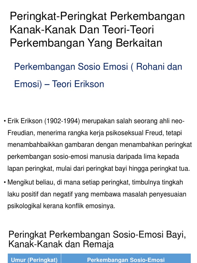 Peringkat perkembangan sosial kanak kanak mengikut teori perkembnagan psikososial erikson autonomi lawan keraguan 1 hingga 3 tahun kanak kanak akan cuba melakukan aktiviti fizikal tanpa memerlukan bantuan orang dewasa contohnya ingin cuba makan dan minum dengan sendiri membuang air memakai kasut dan sebagainya. Perkembangan emosi kanak kanak usia pertengahan.