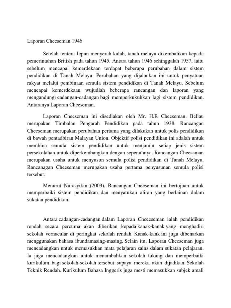 Perkembangan pendidikan di malaysia sebelum merdeka laporan cheeseman. Laporan pendidikan malaysia sebelum merdeka cadangan laporan cheeseman check cadangan ditolak oleh kaum lain dan penyesuaian cadangan telah dibuat cadangan laporan barnes selepas tiga thn pelaksanaan ordinan pendidikan 1952 kerajaan jajahan british menubuhkan j k kabinet 1955 utk menilai semula dasar pendidikan. 2 laporan cheeseman laporan ini disediakan oleh mr h r cheeseman timbalan pengarah pendidikan pada tahun 1946. J k ini diketuai oleh tun hj. Laporan barnes 1949 untuk satukan semua sekolah vernakular.