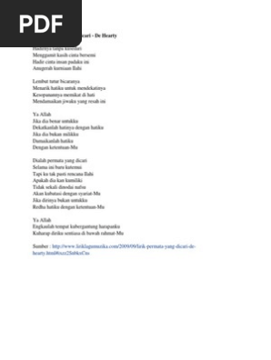Permata yang dicari lirik. Anugerah kurniaan ilahi lembut tutur bicaranya menarik hatiku untuk mendekatinya kesopanannya memikat di hati mendamaikan jiwaku yang resah ini. Lirik lagu permata yang dicari de hearty. Hadir cinta insan padaku ini. Mendamaikan jiwaku yang resah ini ya allah jika dia benar untukku dekatkanlah hatinya dengan hatiku jika dia bukan milikku damaikanlah hatiku dengan ketentuan mu dialah permata yang dicari selama ini baru kutemui tapi ku tak pasti rencana ilahi apakah dia kan kumiliki tidak sekali dinodai nafsu akan kubatasi dengan syariat mu jika dirinya bukan.