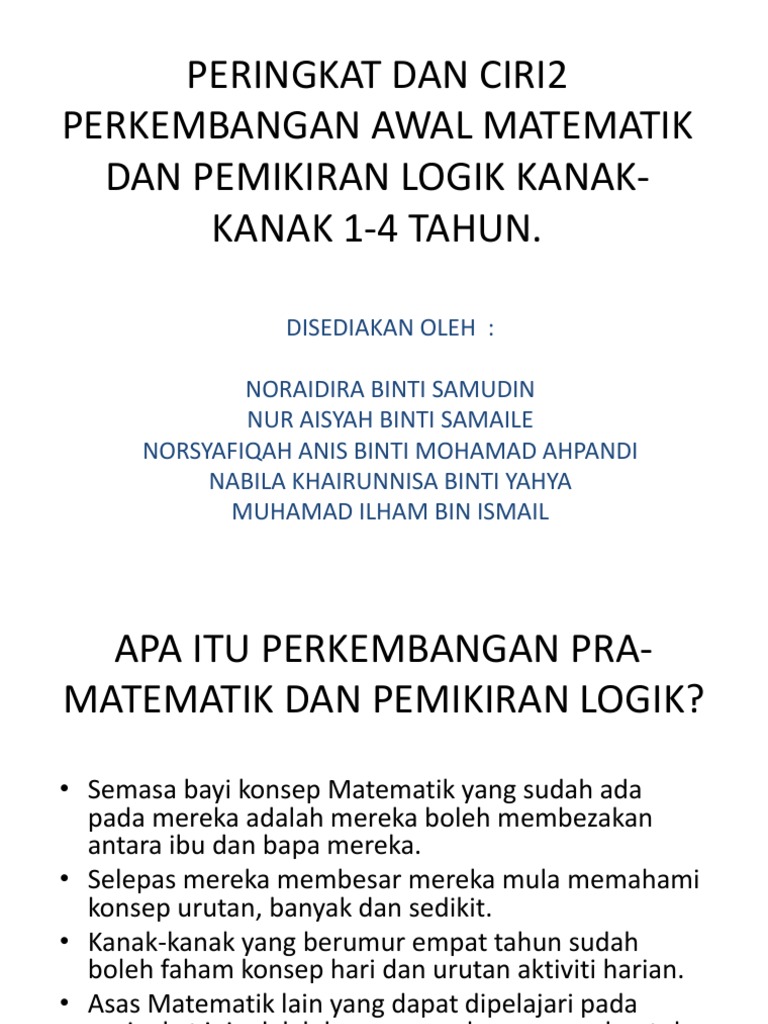 Matematik awal kanak kanak ecs 2153 disampaikan oleh. 0195451002 0134423750 email. Perkembangan pemikiran matematik pada peringkat awal kanak kanak. Perkembangan awal matematik dan pemikiran logik kumpulan 5 siri 3 5 november 2014 tang dynasty park hotel kt objektif.