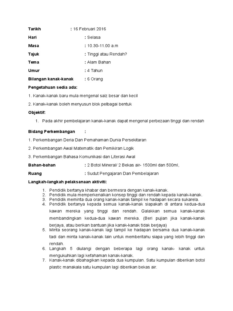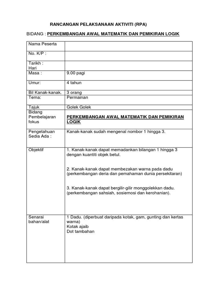 Amali kursus asuhan permata untuk rancangan perlaksanaan aktiviti rpa. Aktiviti awal matematik dan pemikiran logik untuk kanak kanak 7 50 am. Lagi contoh rancangan pelaksanaan aktiviti rpa yang boleh digunakan oleh para pendidik pengasuh di taska bagi merancang aktiviti yang menarik untuk kanak kanak. Ice breaker nyanyi lagu.