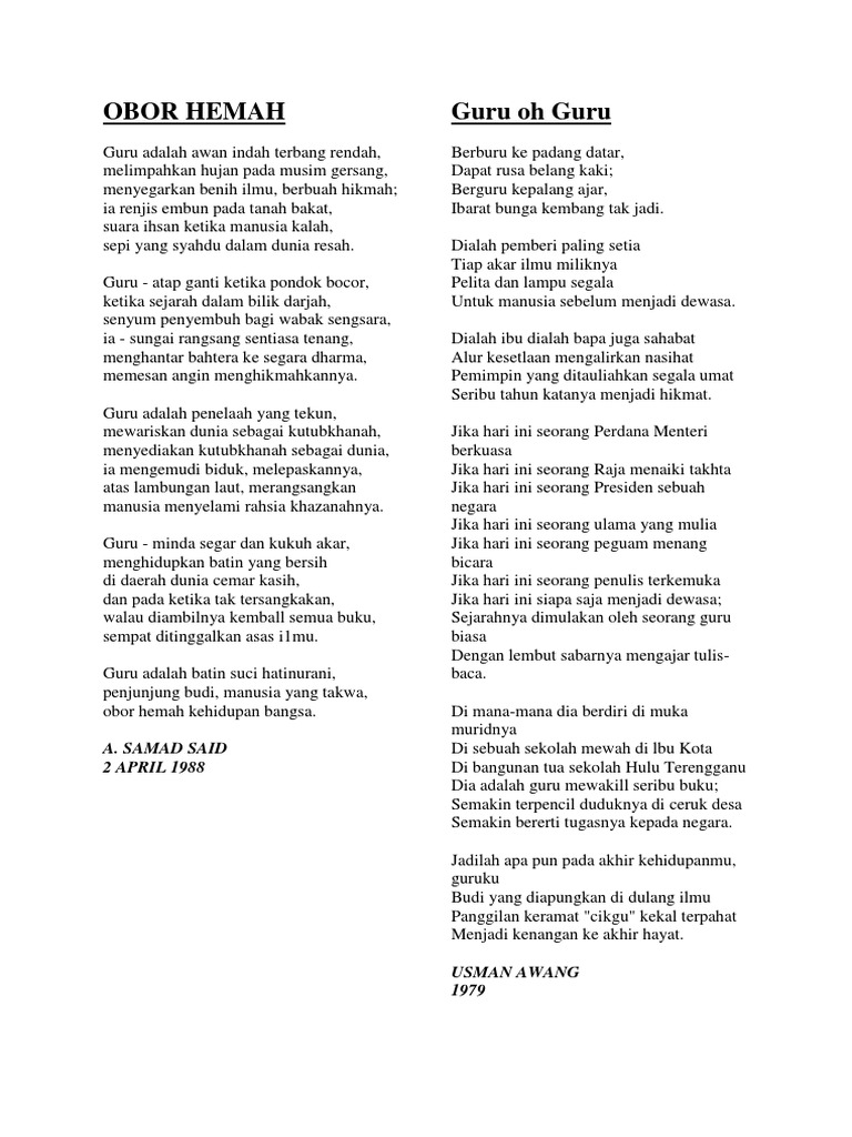 Terima kasih buat nurul iman talib atas kesudian untuk mendiklamasi sajak buat semua guru guru d. Sajak nukilan a samad said hai melayu monday august 25 2014. Mungkin dari sajak ini boleh lihat dilemma seorang guru yang mendidik di zaman sekarang. Di sebalik kekangan dalam tugas mereka tanggungjawab yang dipikul tidak pernah jadi kurang malah semakin bertambah setiap masa.
