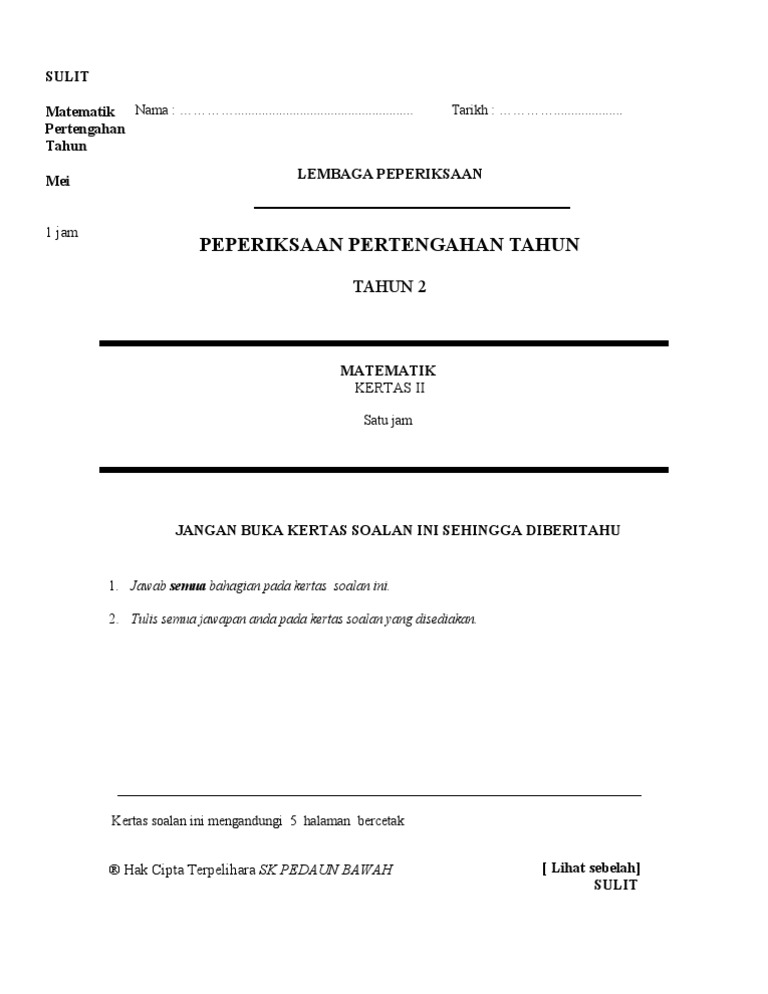 Bank soalan peperiksaan pertengahan tahun 2 adalah antara himpunan himpunan soalan yg berjaya kami sediakan utk menjadi panduan dan rujukan kepada guru pelajar. Koleksi soalan ujian mac tahun 2 k. Dibina bersempena kehadiran bulan mei seperti semua sedia maklum peperiksaan pertengahan tahun akan dilangsungkan di kebanyakan sekolah di seluruh negara. Bahasa melayu bm bahasa inggeris english matematik mathematics sains science bahasa cina.