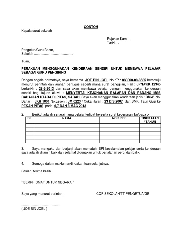 Menteri kanan pertahanan datuk seri ismail sabri yaakob berkata ia bagi mengelakkan mereka daripada dikenakan kompaun oleh pihak polis. Surat kebenaran menggunakan kenderaan membawa murid pelajar ke aktiviti luar sepanjang tahun sekolah iaitu murid pastinya akan banyak terlibat dengan pelbagai program yang diadakan di luar sekolah seperti pertandingan sukan koakademik bahasa melayu dan bahasa inggeris mtaq dan pelbagai lagi. Tujuan surat pelepasan dari bank ini adalah untuk memberi kebenaran kepada pemilik kenderaan membawa kereta tersebut dengan melalui jabatan kastam diraja malaysia di pelabuhan nanti. Hantar dokumen kepada bank.